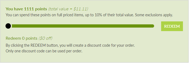 Eco Rewards points cannot be redeemed in the same transaction as a newsletter discount code. If you choose to use a newsletter discount code, the redeem points slider is not visible at the checkout.